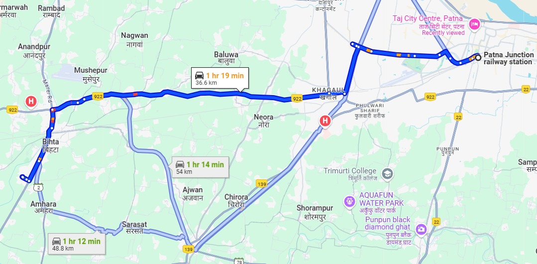 • Head Ashiana More Rd, Anisabad - Jagdeo Path Rd/Jagdeo Path - Anisabad Rd and Rukunpura - Khagaul Rd to NH 30 in Khagaul, Adampur approx (8.8 km).