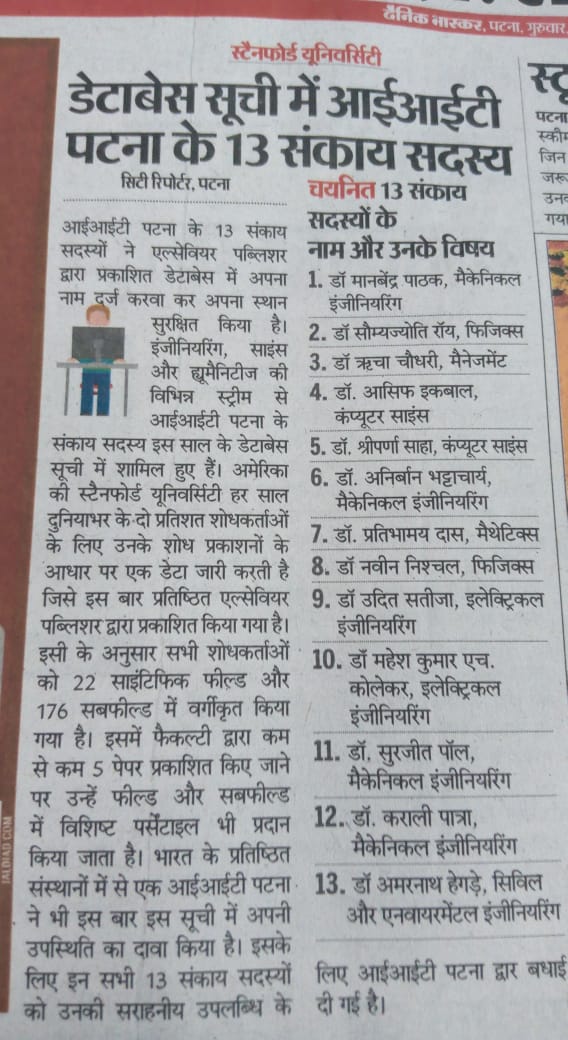 Our faculty members, Dr. Asif Ekbal and Dr. Sriparna Saha are listed in the list of the top 2% of scientists in the world published by Stanford University, Elsevier. Some media reports on this are attached herewith.