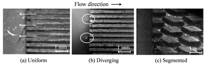 In recent years, power density in electronic devices has been drastically raised due to increase in system's operating frequency, interconnect resistance, package densities and decrease in physical size of the components. This has lead to high heat generation in the device and quickly reaching a high temperature which cannot be cooled down by present package-level cooling techniques using air as coolant. Liquid coolant flow through microchannles or microchannels as heat sinks has emerged as feasible solution for such problems. One of the advantages of microchannels as heat sinks is higher heat transfer rate due to high surface to volume ratio. Besides higher heat transfer rate they are also compact and can be fabricated inside a physical size of chips. Further two-phase evaporative flow or flow boiling in microchannels is more effective than the single phase flow due to involvement of latent heat in the process. High heat removal using low coolant flow rate and temperature uniformity in the channels are two favourable characteristics of two-phase cooling technique. However during flow blowing, growing bubbles restrict the flow of coolant in confined microchannels and impose the back flow of the coolant. This results the increase and fluctuation of temperature, pressure causing instability and poor heat transfer. Efforts have been made by our group to reduce the flow instability by incorporating geometric modifications of the microchannels. Two-geometric variations i.e. diverging and segmented finned microchannels are experimentally investigated for reducing flow boiling instability in microchannels.